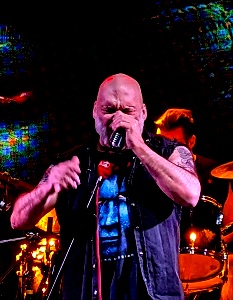 Llegó el momento y Blaze Bayley salió al escenario mordiendo fuerte junto a unos miembros de Absolva que siempre son unos escuderos de auténtico lujo. Aún no me quito de la cabeza su último paso por Madrid representando únicamente temas de The X Factor y Virtual XI. Fue un éxtasis de concierto, paroxismo puro y, sin duda, el mejor modo de disfrutar de los temas de ambos álbumes en directo en la actualidad, pues los hermanos Appleton y Martin McNee a la batería son un valor seguro para el británico, que siempre se ha rodeado, desde la edición del celebérrimo Silicon Messiah, de músicos de primer nivel. Nada de nombres grandilocuentes ni estrellas, pero sí talentos enormes, tanto en lo compositivo como en lo técnico. Precisamente a eso vino a Guadalajara en esta ocasión: a celebrar el 25 aniversario del que para un servidor puede ser el mejor disco de su carrera como Blaze (a secas, ya que luego vendrían los álbumes firmados como Blaze Bayley). Tampoco están de más temas del gran Tenth Dimension e incluso del denostado en su época Blood & Belief, pero quién sabe si nuestro protagonista no decidirá celebrarlos en sus respectivos aniversarios. El caso es que la banda vino con lo puesto, utilizando la batería de Baja California, y es que realizar una gira con numerosas fechas por salas pequeñas debe hacerse en estas condiciones. Solamente aprovecharon la pantalla de Óxido para adornar, aunque tampoco hizo falta demasiado artificio para la gran celebración, todo sea dicho.