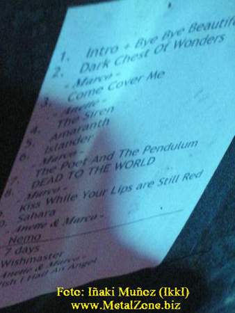 Tras una gran espera y los pitos de impaciencia por parte del público se empezó a oír la intro que daba señal del inicio del conciertazo que nos iban a ofrecer los finlandeses Nightwish con su nueva vocalista Anette.