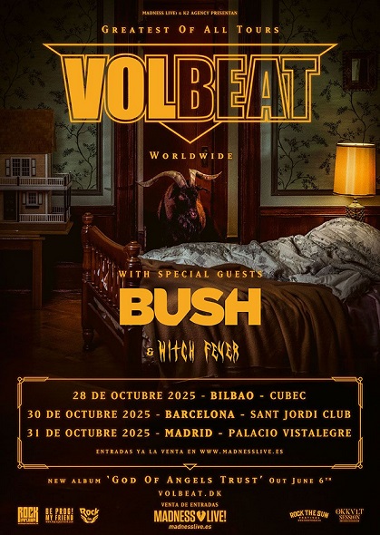 Volbeat regresa a España con su nuevo álbum 'God Of Angels Trust' y tres citas imprescindibles: el 28 de octubre en el BEC de Bilbao, el 30 de octubre en el Sant Jordi Club de Barcelona y el 31 de octubre en el Palacio de Vistalegre de Madrid.