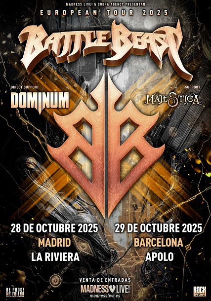 Battle Beast llega a España para ofrecer dos noches inolvidables de pura energía y estribillos pegadizos. La banda finlandesa se presentará el 28 de octubre en La Riviera de Madrid y el 29 de octubre en la Sala Apolo de Barcelona, prometiendo una experiencia electrizante en una fiesta única.
